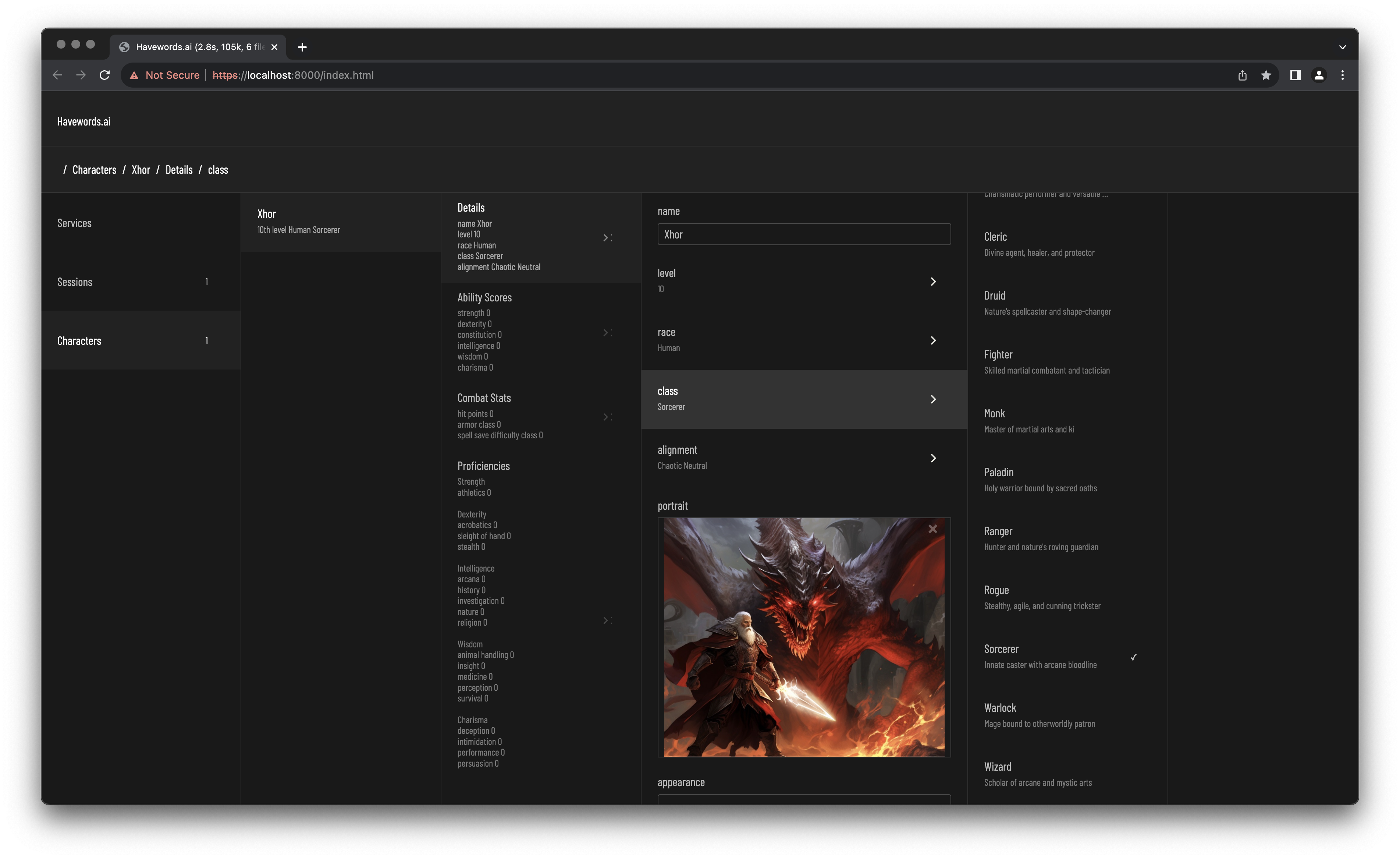 This ratio — approximately 90% auto-generated views — is the practical test of the composable primitive approach. The domain model is non-trivial: character sheets have deeply nested hierarchies (character → ability scores → individual scores → modifiers), campaigns contain recursive location trees, and the session system manages real-time state across multiple connected clients. Despite this complexity, the default tiles and master-detail views produce navigable, usable interfaces throughout.